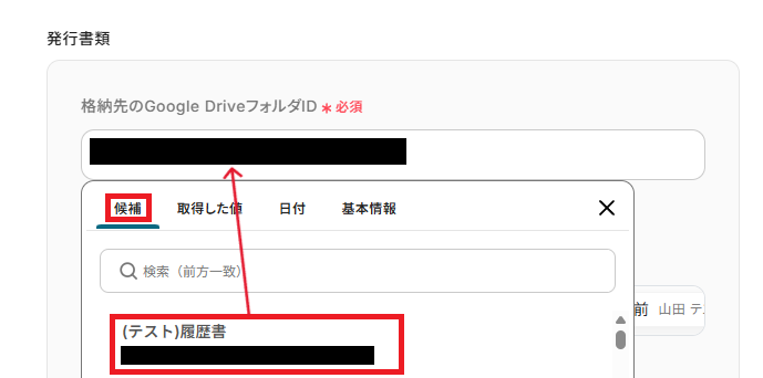 Google スプレッドシートの「レコードを取得する」オペレーションでは、候補者リストが記載された任意のスプレッドシートIDとタブ名を設定してください。 Googleドキュメントの「書類を発行する」オペレーションでは、履歴書のテンプレートとなるドキュメントのファイルID、作成された履歴書を格納するGoogle DriveのフォルダID、および出力する際のファイル名をそれぞれ任意で設定してください。 ■注意事項
