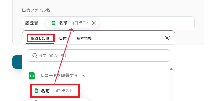 「出力ファイル名」は、下図のように取得した値を活用して自由に入力できます。 用途に合わせて、固定値と変数(取得した値)を組み合わせ設定してみましょう。 設定したら「次へ」進んでください。