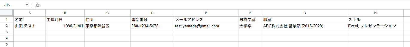 ステップ4:Google スプレッドシートのアクション設定 Google スプレッドシートのレコード情報を取得する設定を行います。まず、履歴書を作成するための情報が記載されたシートを作成しておきましょう。 作成する内容は、架空の情報(「テスト太郎」や「株式会社テスト」など)でOKです。