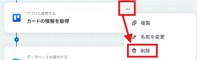 例えば、Asanaをトリガーにしたい場合、Trelloの「カードが指定のリストへ移動されたら(Webhook)」トリガーと「カードの情報を取得」アクションを削除します。
