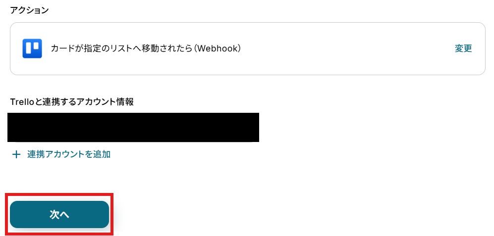 「Trelloと連携するアカウント情報」を確認し、「次へ」をクリックして進んでください。