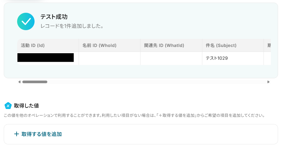テストに成功すると「取得した値」に反映されます。