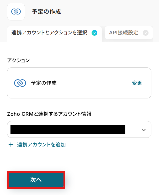 次に、Googleフォームから取得した内容を基に、Zoho CRMで予定を作成するアクションの設定を進めていきましょう。