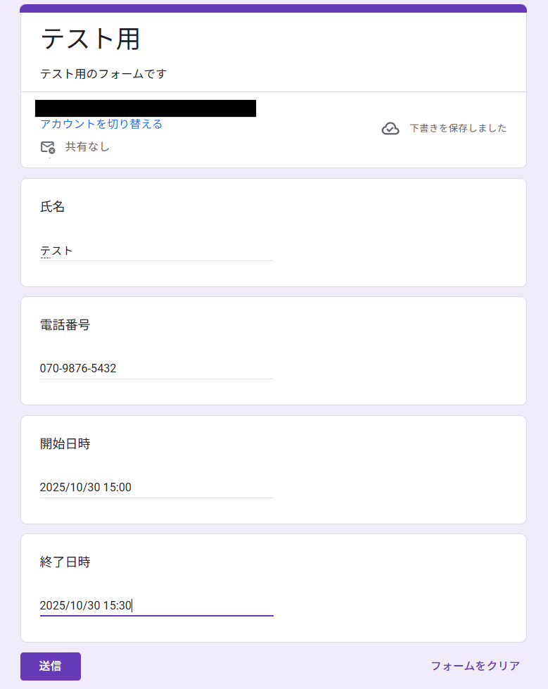 この後行う連携テストのために、Googleフォームの作成と回答の送信まで行っておきましょう。