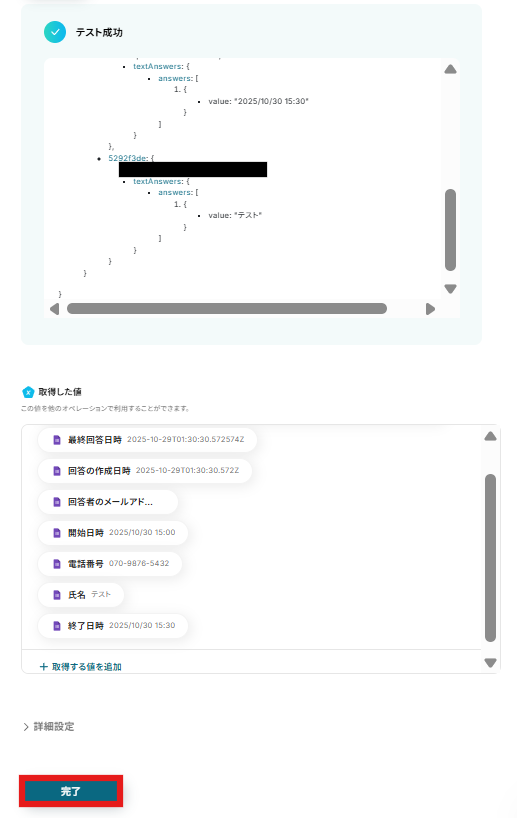 テストが成功したら「取得した値」が表示されます。