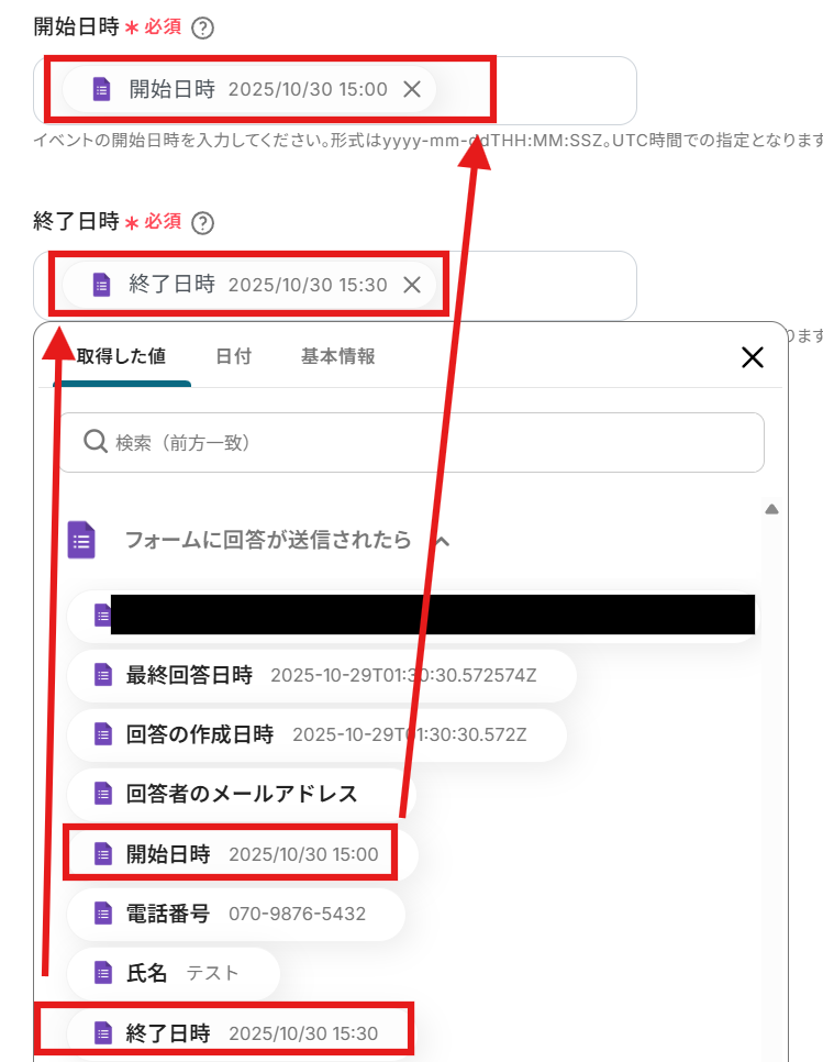 入力欄をクリックすると選択肢が表示されるので、先ほどGoogleフォームのトリガー設定で取得した値の中から選びましょう。