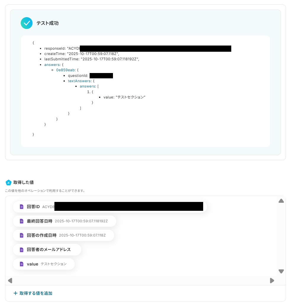 ・Googleフォームをトリガーとして使用した際の回答内容を取得する方法は下記を参照ください。