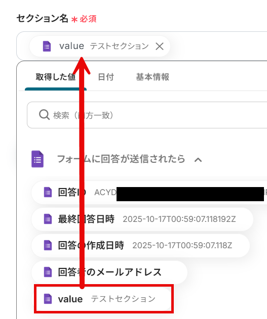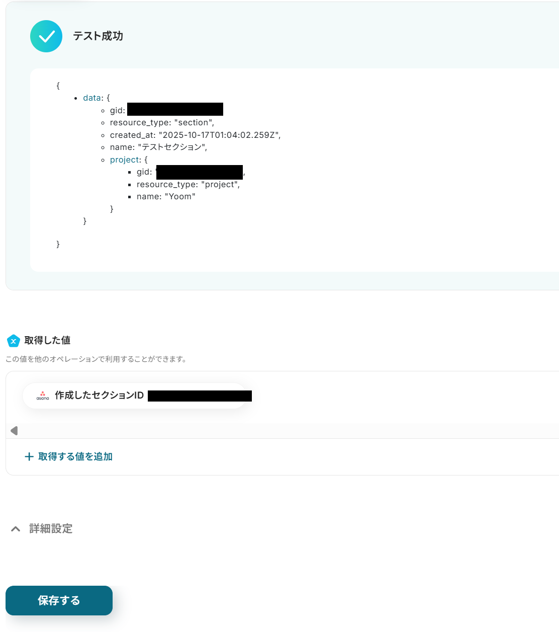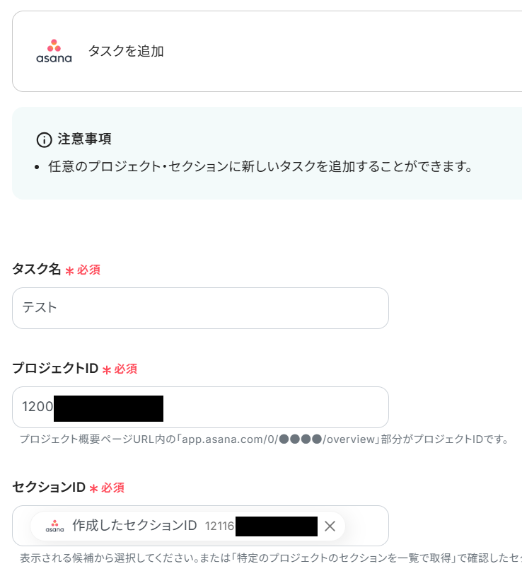 前項で取得した値から、Asanaのセクションを作成する設定を行いましょう。
