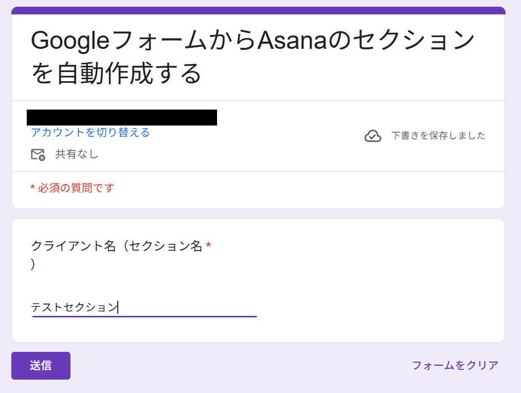注釈に従ってフォームIDを入力したら、「テスト」をクリックしてください。
