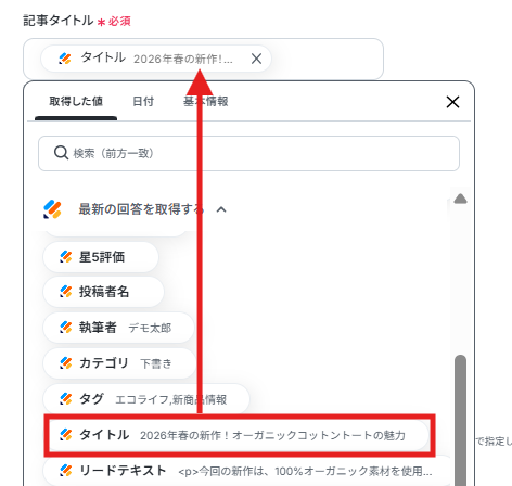 - Shopifyでブログ記事を作成する際に、Jotformのどの回答項目をタイトルや本文に引用するかを任意で設定できます。