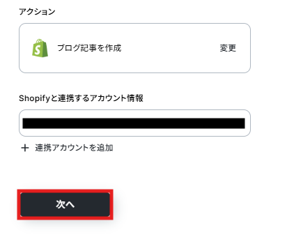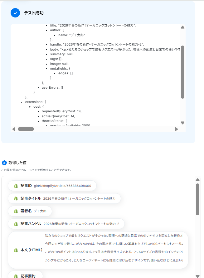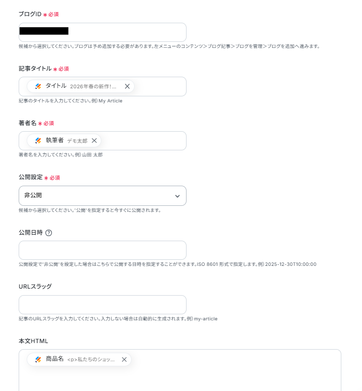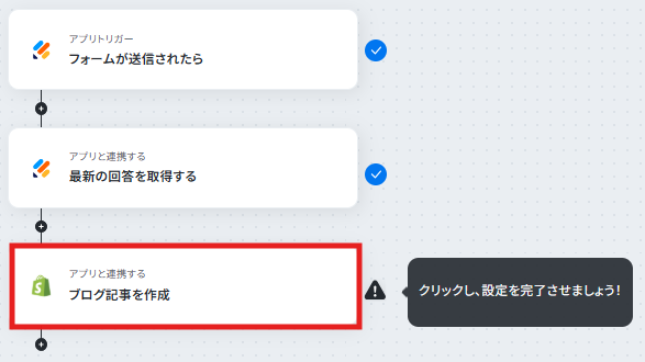 - 最後に、オペレーションでShopifyの「ブログ記事を作成」アクションを設定し、取得したフォームの内容をブログ記事として作成します。