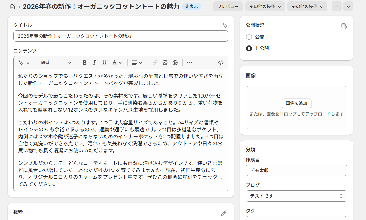 - Shopifyで作成されるブログ記事は、公開・非公開のステータスや著者、タグなども任意で設定することが可能です。