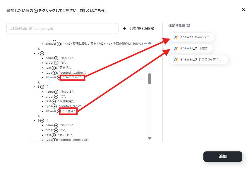 なお、すべての値が取得できる訳ではないため、取得したい最新の回答をJSONPATHを使用して追加します。