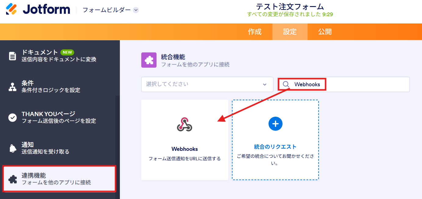 JotformのWebhookはフォーム設定から連携機能をクリックし、Webhookを検索して設定してください。