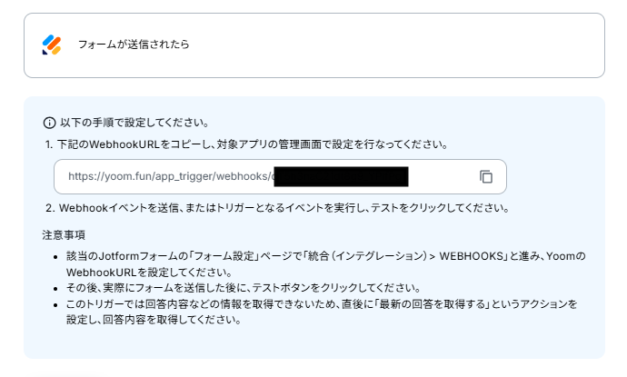 - JotformのWebhook設定および回答取得の方法は「JotformのWebhook設定と最新回答取得方法について」をご参照ください。