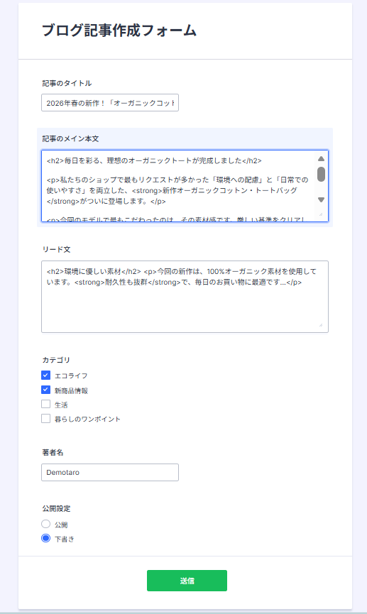 今回は、フォームの内容をそのまま反映しましたが、固定値でHTMLタグをいれ、間に取得した値を入れることもできます。