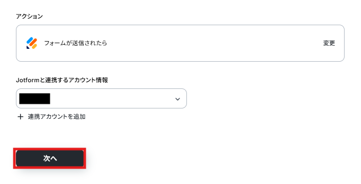 アクションは変更せず、アカウント情報がマイアプリ連携をしたアカウントと一致することを確認したら、「次へ」をクリック。
