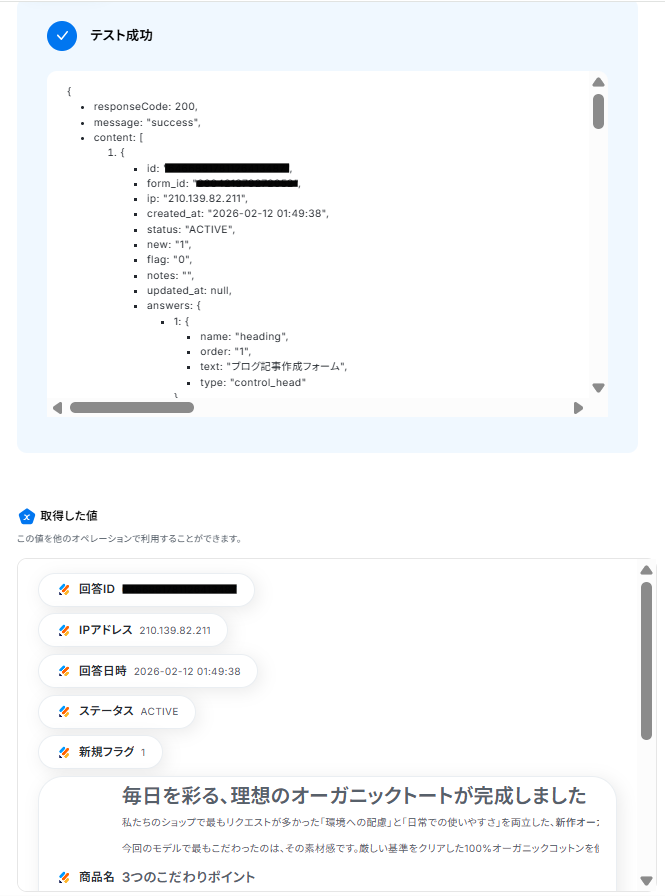 テストに成功すると、「取得した値」に情報が追加されます。