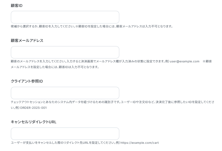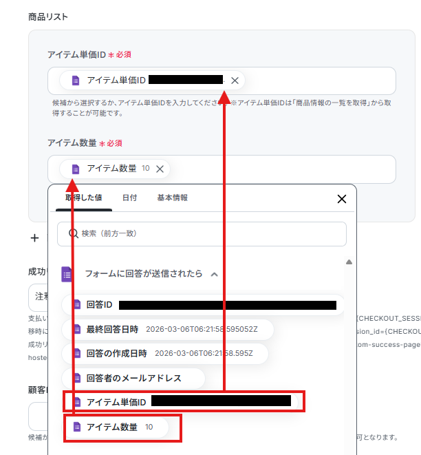- Stripeのオペレーションでは、フォームで取得した回答内容を変数として引用し、Checkoutセッションの各フィールドに自由に設定することが可能です
