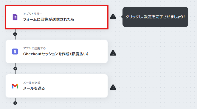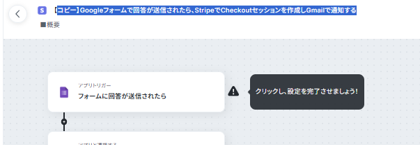 - Googleフォームのトリガー設定とStripe、Gmailのアクション設定