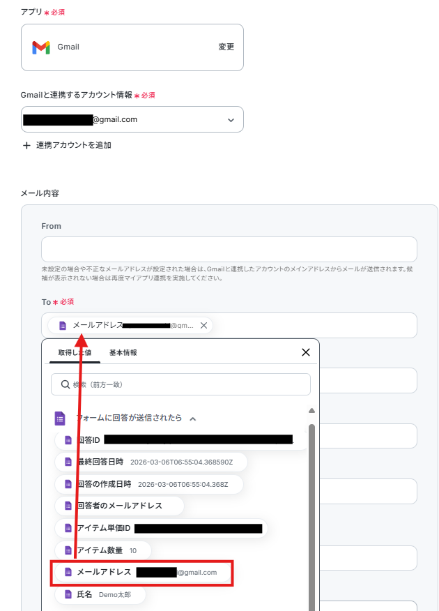 toはフォーム回答で取得した値を活用して設定しています。