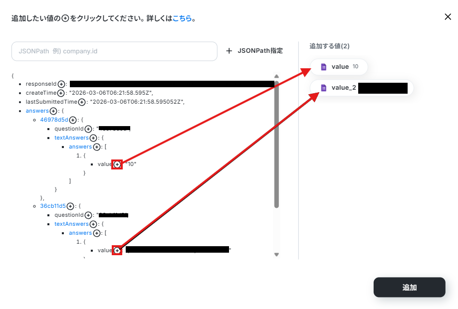 - Googleフォームをトリガーとして使用した際の回答内容を取得する方法は「Googleフォームトリガーで、回答内容を取得する方法」を参照ください。