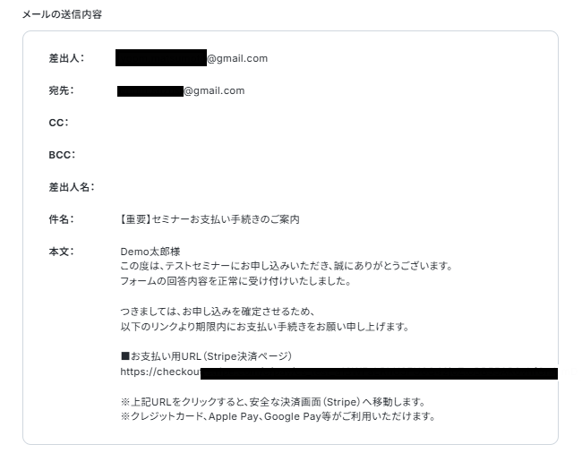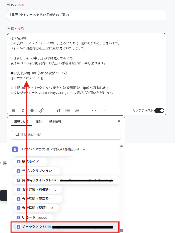 本文にはフォーム回答で取得した氏名やステップ4の取得した値からチェックアウトURLを設定しました。
