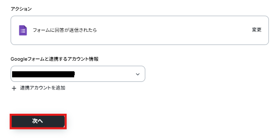 アクションは変更せず、アカウント情報がマイアプリ連携をしたアカウントと一致することを確認したら、「次へ」をクリック。