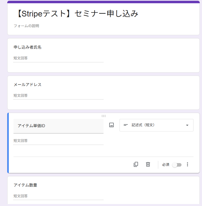 今回は数量とアイテム単価ID、氏名とメールアドレスも追加しました。
