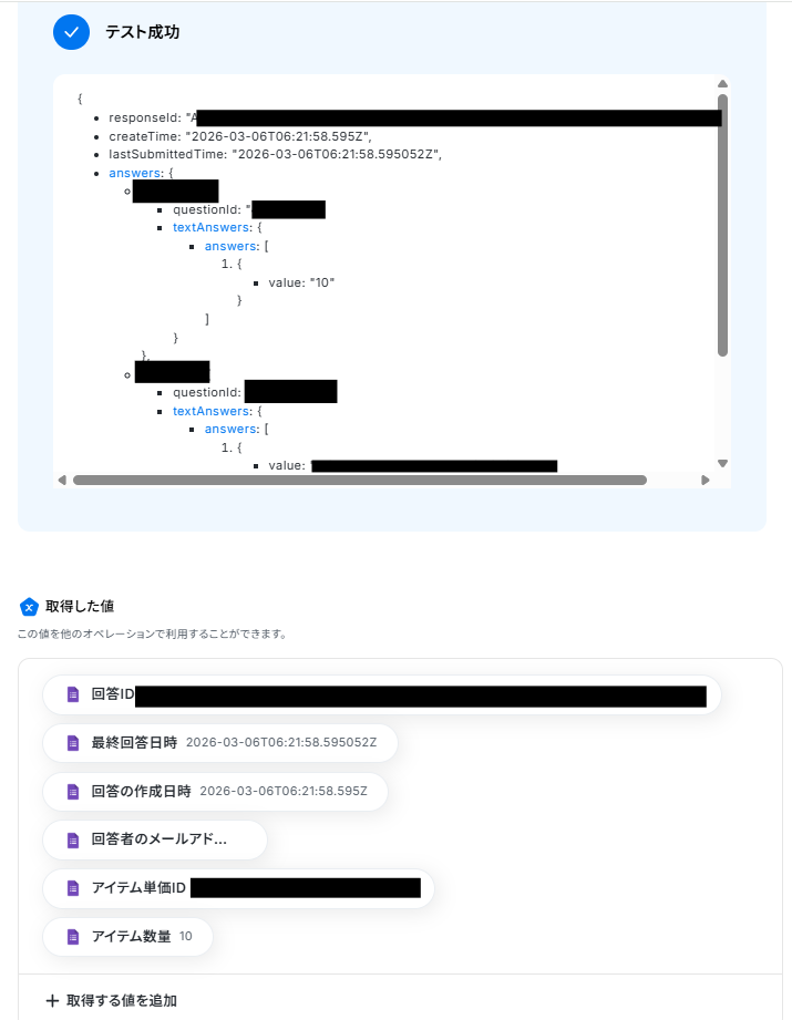 テストに成功すると、「取得した値」に情報が追加されます。