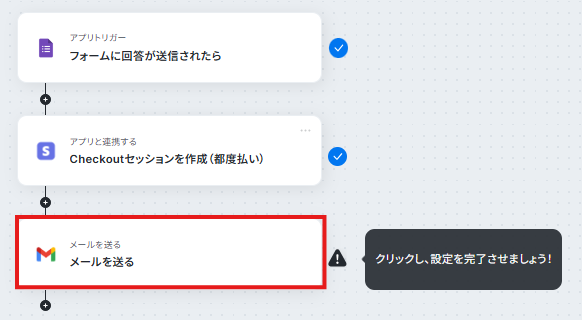 - 最後に、オペレーションでGmailを選択し、「メールを送る」アクションを設定して、作成された決済リンクを送信します