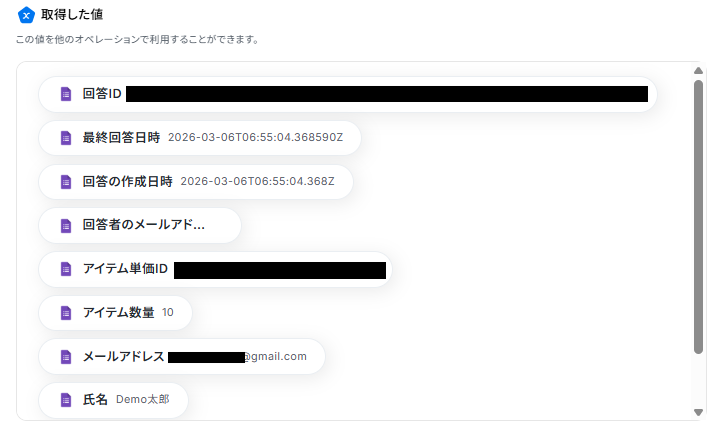 なお、Googleフォームでデフォルトで取得できる値は、「回答ID」「最終回答日時」「回答の作成日時」「回答者のメールアドレス」のみとなっており、ユーザーの回答内容を取得するためには、手動でアウトプットを追加する必要があります。