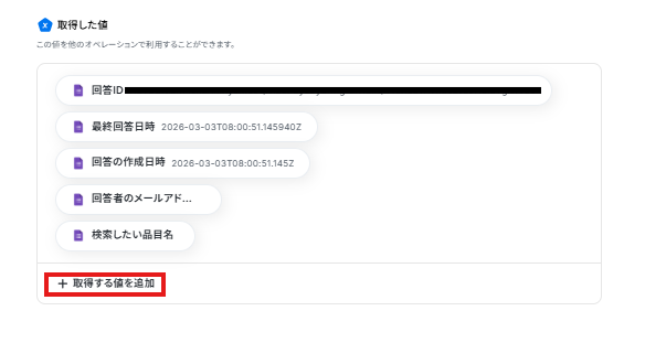Googleフォームトリガーで、回答内容を取得する方法を参考に「取得する値を追加」から設定してください。