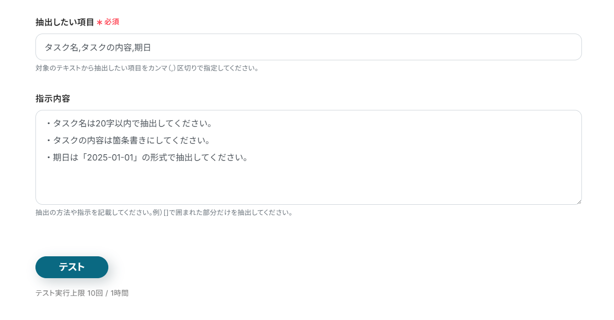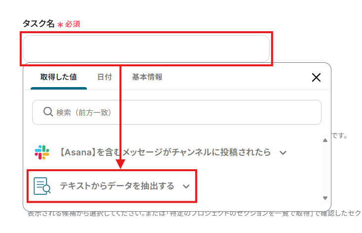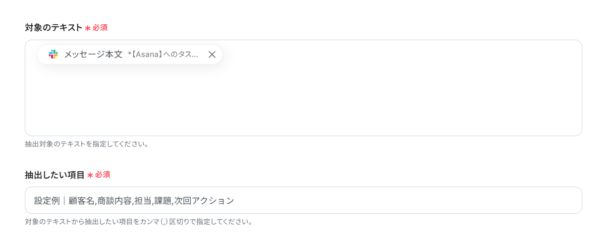 「抽出したい項目」に、目的に応じて任意の項目を設定。 ここで抽出した項目をAsanaのタスク追加に用います。 ※ タスク追加にはタスク名が必須です。 ※ タスクの開始日や期日は「2021-01-01」という形式で設定します。