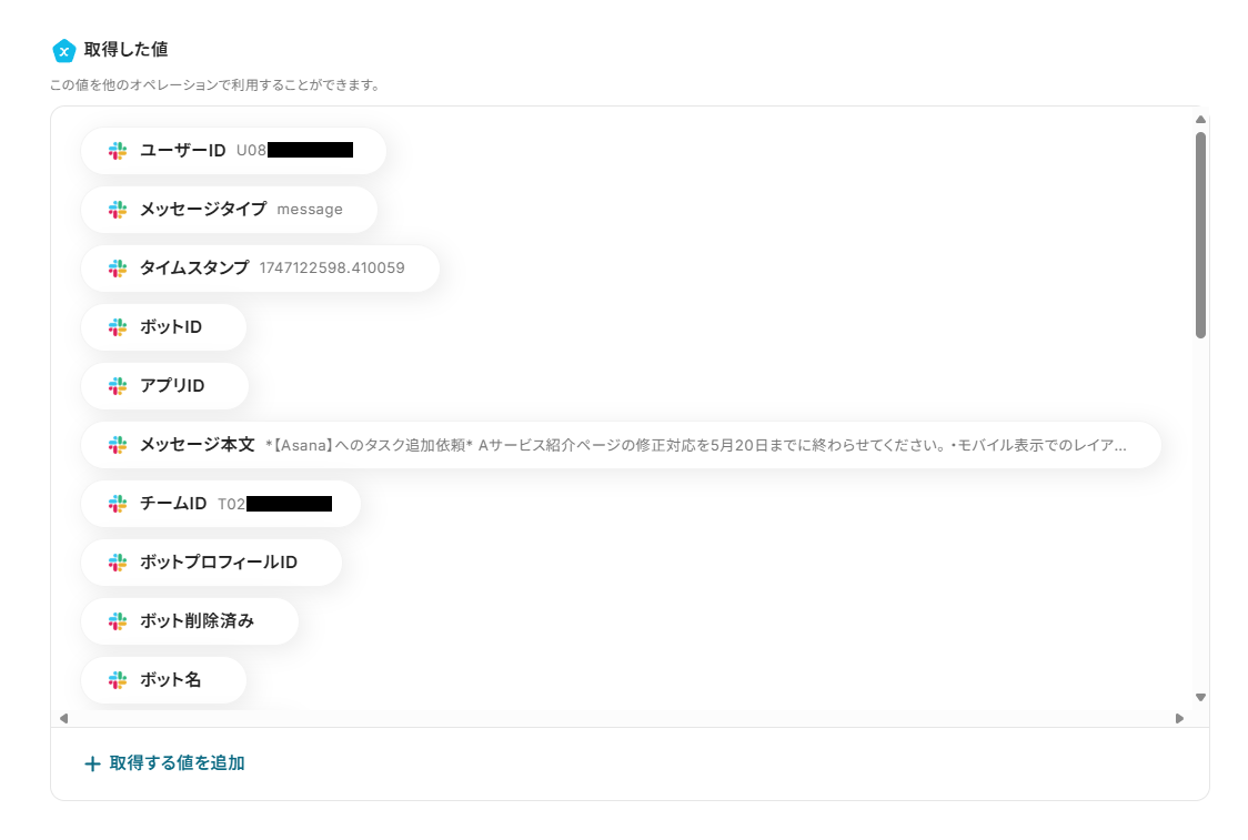 テストに成功すると、「取得した値」に投稿されたメッセージの情報が追加されます。