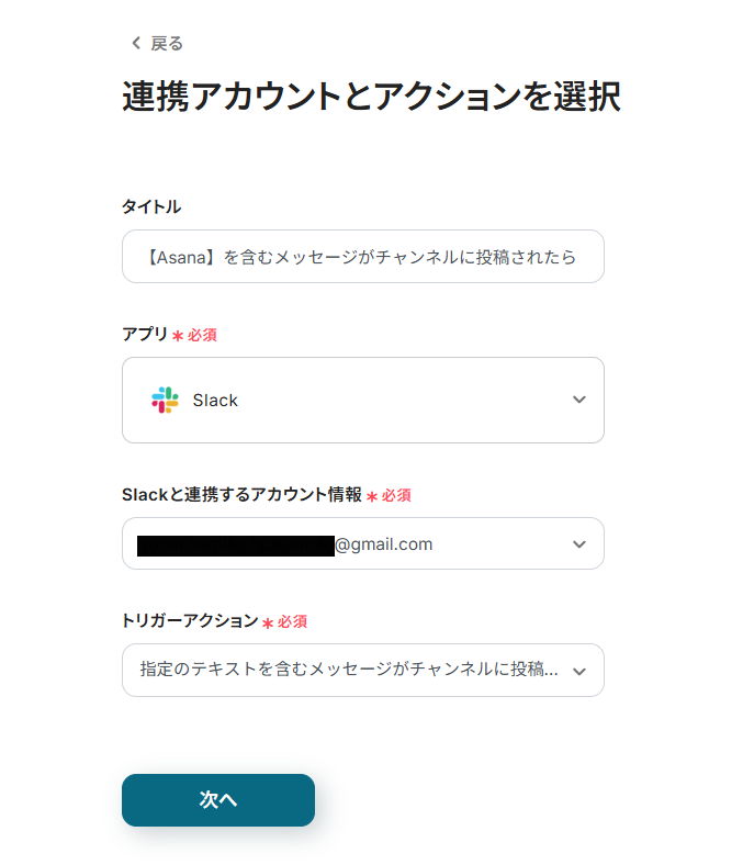 「タイトル」は任意の名称に変更できます。 アクションの内容が分かりやすいタイトルにするとよいでしょう。 ここでは例として「【Asana】を含むメッセージがチャンネルに投稿されたら」に変更しています。