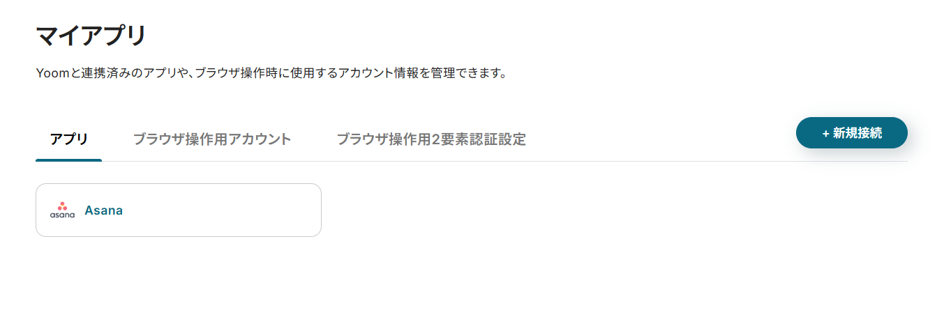 先ずは、Yoomと連携させたいAsanaアカウントとSlackアカウントを「マイアプリ」に登録しましょう。 この設定は初回のみ必要です。