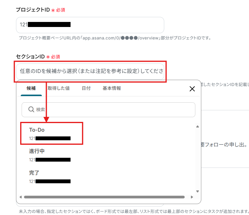 「セクションID」にタスクのセクションのIDを設定。 入力欄をクリックすると、指定したプロジェクトから候補が表示されるので、対象となるセクションを選択してください。