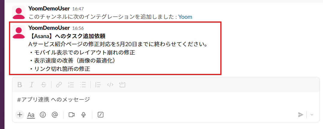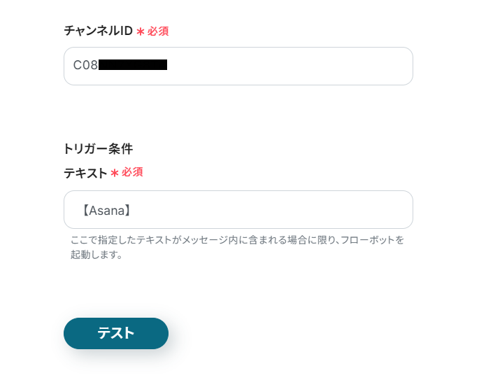 設定を終えたら、Slackの指定したチャンネルに、Asanaに追加したいタスクの内容を投稿してください。 直近1時間以内に、設定したテキストを含むメッセージが投稿されていない場合はテストに失敗します。 ※ 投稿するメッセージの例
