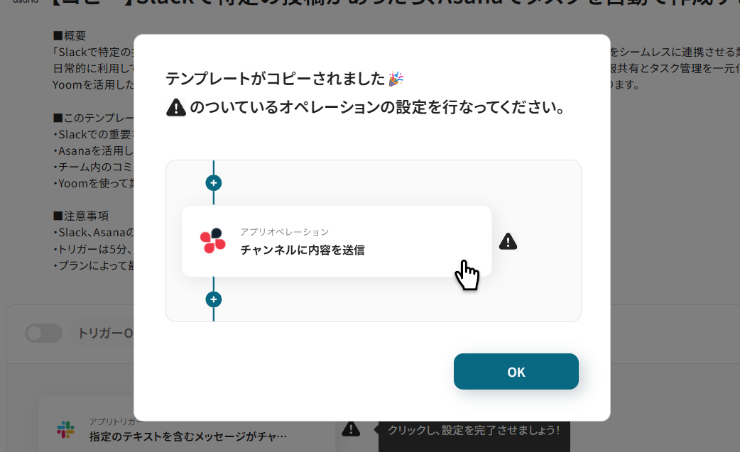 そうしますと、Yoomのワークスペースにテンプレートがコピーされ、自動化フローの設定画面(フローボット)が開きます。 「OK」をクリックして、フローの設定に進みましょう。