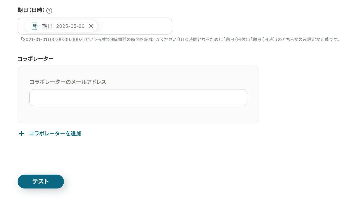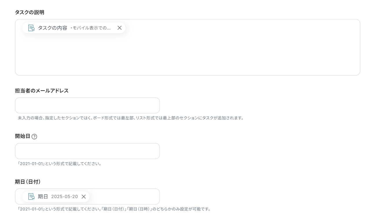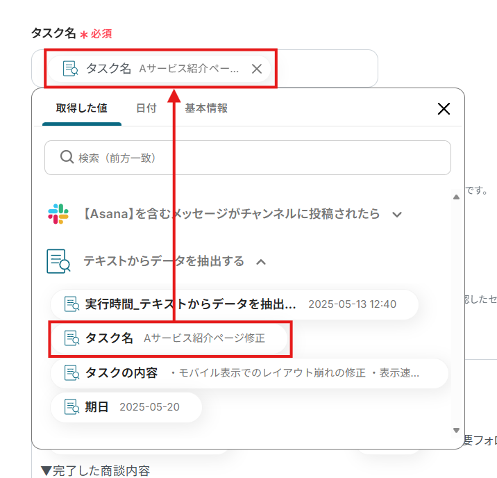その他の項目も、必要に応じて設定してください。 タスク名と同様に「取得した値」から項目を選択します。