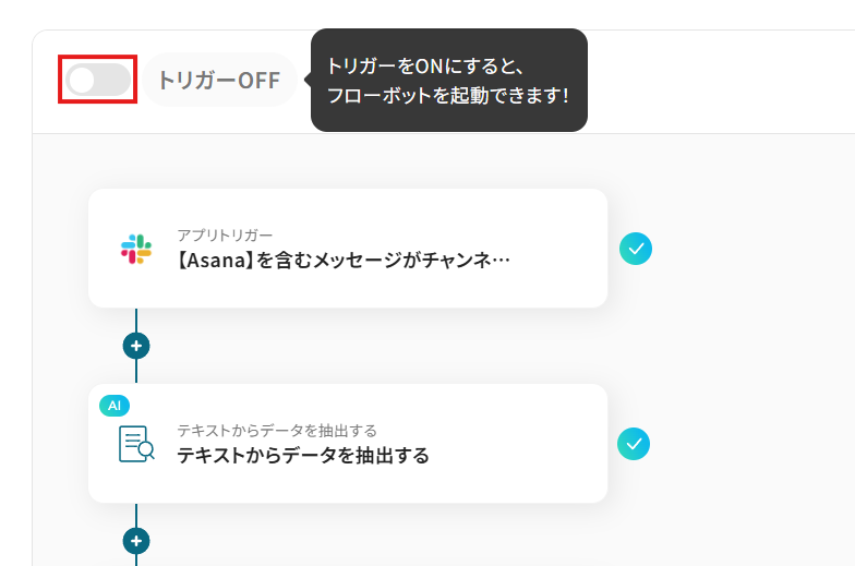 あとで稼働させる場合は、フロー画面のトリガースイッチをクリックすることで、トリガーをONにできます。