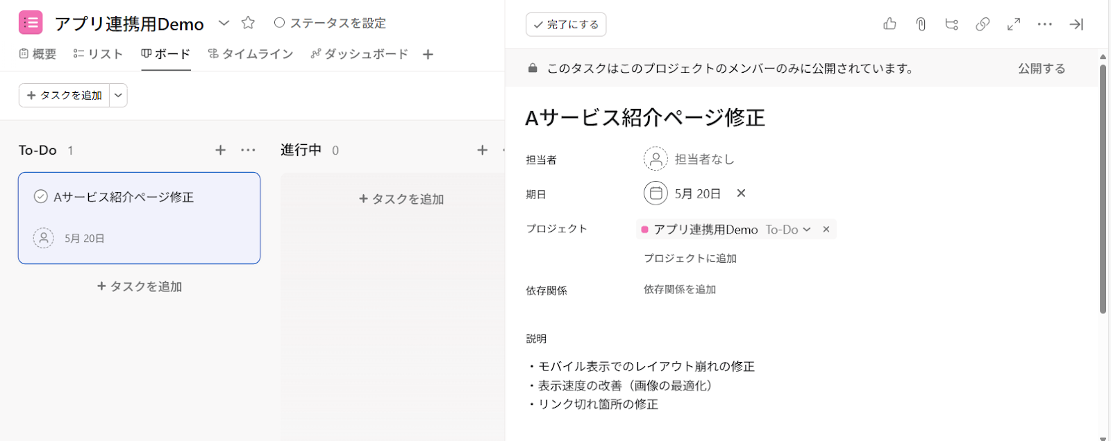 テストに成功したら、Asanaの指定したプロジェクトを確認しましょう。 ※ Asanaに追加されたタスク