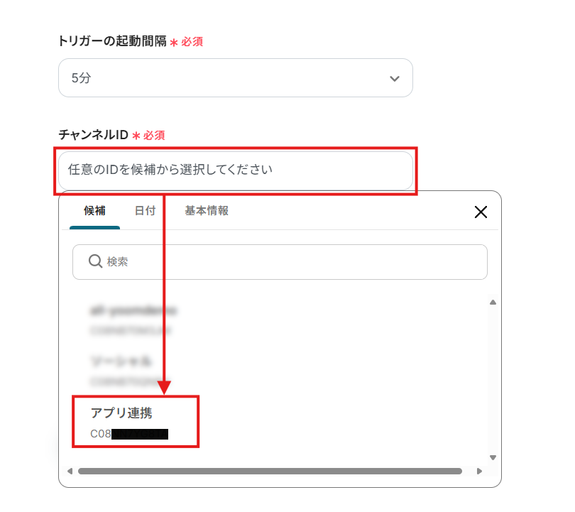 「チャンネルID」にトリガーとなるメッセージを投稿するチャンネルのIDを設定。 入力欄をクリックすると、連携しているSlackアカウントから候補が表示されるため、対象となるチャンネルを選択してください。 検索欄にチャンネル名を入力と検索が楽になります。 ※ ステップ1のアプリ連携時に選択しているチャンネルにはYoomのアプリが追加されていますが、そうでないチャンネルに通知する場合には別途Yoomアプリを追加する必要があります。 詳しくは、こちらの記事 をご参照ください