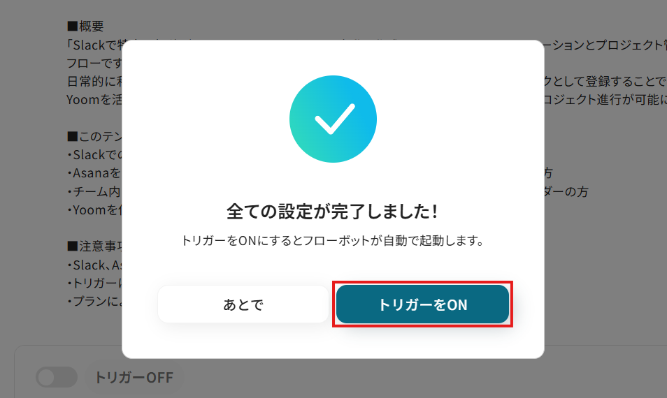 フロー画面に戻り、「全ての設定が完了しました!」と表示されていればフローの設定は完了です。 早速フローを稼働させるのであれば、「トリガーをON」をクリックします。