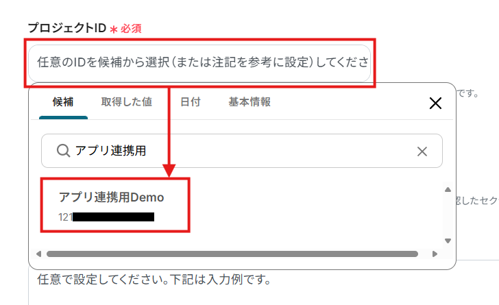 「プロジェクトID」にタスクを追加するプロジェクトのIDを設定。 入力欄をクリックすると、連携しているAsanaアカウントから候補が表示されるので、対象となるプロジェクトを選択してください。 プロジェクトIDはAsanaのプロジェクト概要ページURL(app.asana.com/0/{{ID部分}}/overview)でも確認できます。