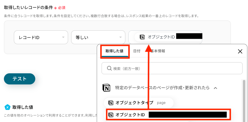 「特定のデータベースのページが作成・更新されたら」の中から「オブジェクトID」を選びましょう。