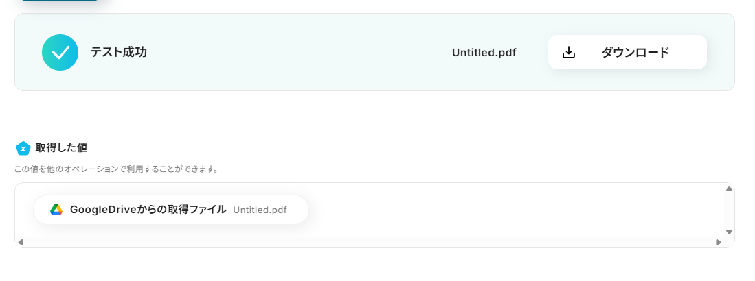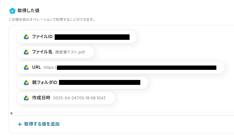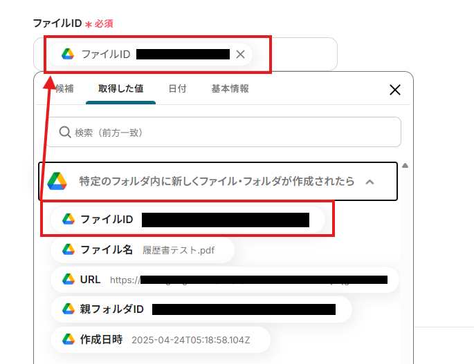 2.API接続設定を行います。 「ファイルID」は、入力欄をクリックして表示されるアウトプット(取得した値)から選択してください。