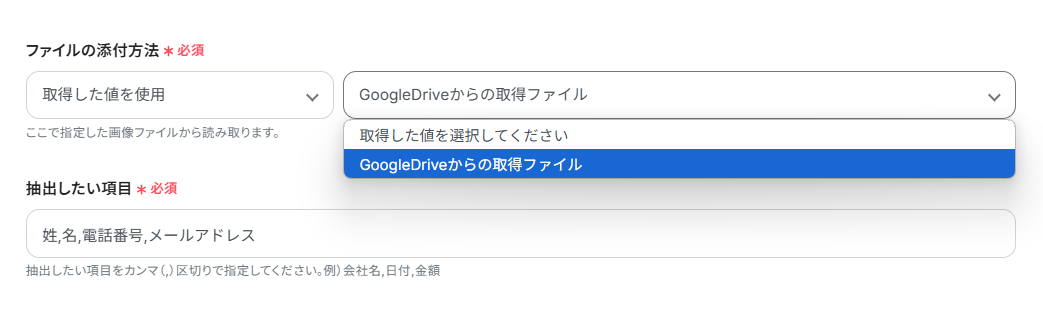 「ファイルの添付方法」はデフォルトで、先ほど添付したファイルが対象になっています。特にこだわりがなければこのままで大丈夫です! 「抽出したい項目」は、抽出したい項目を入力します。今回は以下の画像のように入力しました!