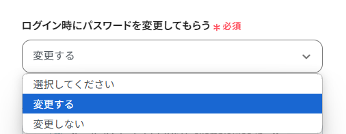 「ログイン時にパスワードを変更してもらう」は、プルダウンから選択してください。 ※パスワードを仮のパスワードから変更したい場合は、変更するを選択しましょう!
